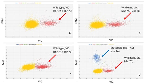 Two-dimensional scatter graphs generated by chip digital PCR (cdPCR) analysis of DNAs from the durum wheat varieties: Miradoux (A), Maestrale (B), Odisseo (C) and target variety (D). The G allele is marked by VIC (red cloud), and the T allele by FAM (blue cloud). All the patterns have a yellow cloud due to DNA-empty wells.