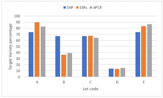 The dPCR assay was used to evaluate the TV percentages present in five TV-declared grain commercial lots, but suspected to be contaminated by non-TV varieties. The same samples also were evaluated with SSR and DArTseq approaches, with the same objective; i.e., to evaluate the TV percentages. Figure 4 shows the results obtained with the three different analytical methods.