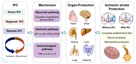 Stroke is a leading cause of death and permanent disability, imposing heavy social and family burdens [1,2]. Ischemic stroke is typically caused by blood vessel blockage, which accounts for approximately 87% of all stroke cases. Over the past few decades, considerable progress has been made in ischemic stroke treatment, typically in intravenous thrombolysis and mechanical thrombectomy. However, these conventional therapies have a narrow therapeutic window: the effective intravenous thrombolytic therapy is within 4.5 h of onset, and that of intra-arterial thrombectomy is within 6 h of onset [3], resulting in only a minority (3–5%) of stroke patients being able to receive these therapies [4]. Meanwhile, although restoring blood flow by thrombolysis and thrombectomy is essential in limiting ischemic neuronal damage, substantial neuronal, glial, and neurovascular damages may still occur, particularly due to reperfusion injury of the penumbra [5]. Furthermore, there exist some serious contraindications and complications; for example, thrombolytic agents have been associated with symptomatic intracerebral hemorrhage [6]. Thus, there is an urgent need to develop new treatment strategies for ischemic stroke. A field of research that continues to show promise in developing therapies for ischemic stroke is ischemic preconditioning (IPC). IPC is an endogenous metabolic protective strategy, whereby several cycles of brief, non-lethal ischemia, followed by reperfusion, confer protection against subsequent, more severe, and lethal ischemia. It was first discovered by Murry et al., in the canine heart, in 1986 [7]. To date, IPC has been replicated in humans and other species, and applied to other organs and tissues (e.g., the brain and kidney). Direct IPC is conducted by brief, direct, repetitive clamping of the target artery, while regional IPC involves a repetitive occlusion of the circumflex artery, which is near to the target artery. In remote IPC, inflation of a blood-pressure cuff on the arm or leg is used [8]. IPC has been reported to exhibit a significant neuroprotective effect, remarkably reducing the incidence of ischemic stroke and improving the prognosis in patients with stroke [9]. As IPC is innocuous, cost-effective, and has fewer or no contraindications, and has exciting new prospects in the broader management of ischemic stroke (Figure 1).