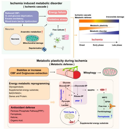 Recent research has shown that metabolic disorders have significant effects, both before and after the onset of ischemic stroke. Long-term metabolic disorders, such as metabolic syndrome (MetS), increase the probability of occurrence of ischemic stroke. The most immediate biochemical alterations in neurons affected by ischemia are mitochondrial dysfunction, shifting the cellular machinery from aerobic to anaerobic metabolism, and energy production decreasing from 32 adenosine triphosphate (ATP) molecules to 2 ATP molecules. Energy failure leads to the depolarization of neurons and activation of specific glutamate receptors dramatically, which further induce the failure of the transmembrane electrochemical gradient established by the Na+, K+-ATPase pump. Then, the accumulated free radicals damage cell membranes, mitochondria, and DNA, thus triggering caspase-mediated cell death. To defend against this ischemic cascade, upon the onset of ischemia, brain tissues enhance their metabolic plasticity to maintain the cerebral activity transiently, mainly through the regulation of cerebral blood flow (CBF), mitochondrial adaption, and other defense systems; however, with persistent ischemia, irreversible damage can occur in the affected brain areas. It should be noted that metabolic reprogramming is a double-edged sword: the overactivation of metabolic reprogramming under ischemia may lead to secondary brain damage (Figure 2).