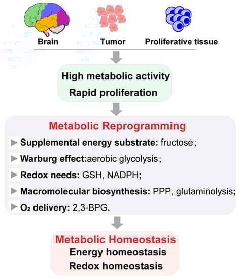 Metabolic reprogramming for metabolic homeostasis maintenance. Brain, tumor, and proliferative tissues have high metabolic activity and energy requirements, necessitating that they have reliable mechanisms to adequately protect their metabolic homeostasis. Metabolic reprogramming is notably crucial in this regard, especially for energy and redox homeostasis maintenance.