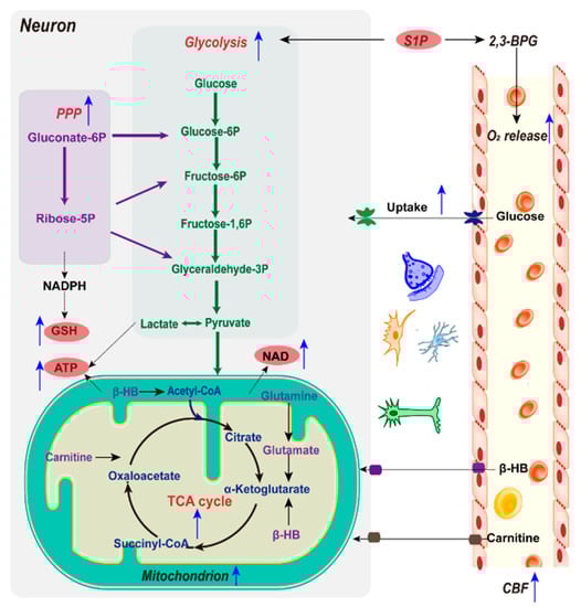 Metabolic reprogramming by ischemic preconditioning (IPC). For blood glucose and oxygen supply, IPC increases regional CBF and regulates the oxygen-delivery ability of erythrocytes through sphingosine 1-phosphate (S1P), in order to maintain glucose and oxygen metabolic consumption. To enhance energy reserves, IPC improves mitochondrial efficiency for cellular energy metabolism, boosts glycolysis, and stockpiles and utilizes alternative energy substrates. Meanwhile, IPC also boosts the PPP, providing an essential redox equivalent for GSH regeneration and enhancing the capacity of antioxidant defense.