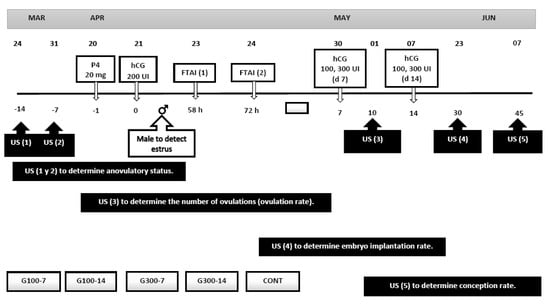 Schematic representation of the experimental protocol. The application of hCG (100 and 300 UI) was on day 7 and 14 post-FTAI. Ultrasound (US) was performed to determine anovulatory status, the number of ovulations (ovulation rate), the embryo implantation rate, and conception rate.