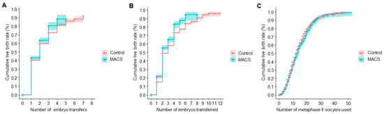 Concerning CLBR, cycles in the MACS group required a lower number of embryos to be transferred until a live birth rate was reached compared to the non-MACS group. Despite the MACS group needing a higher number of MII oocytes than the non-MACS group to obtain the same result, this difference was around 3.3% when consuming 20 oocytes, which, clinically, is meaningless for the patients in terms of increasing or lowering their possibilities to achieve a pregnancy. Results of the Cox regressions were consistent with the conclusions obtained from the univariate analysis: Even though the Mantel–Cox test showed a significant difference between Kaplan–Meier curves of the reference and MACS groups, the small difference observed (a 10.0% increase in CLBR when four embryos were transferred) was more likely due to covariates such as the female patients’ age and BMI rather than by the use of MACS during semen sample processing.