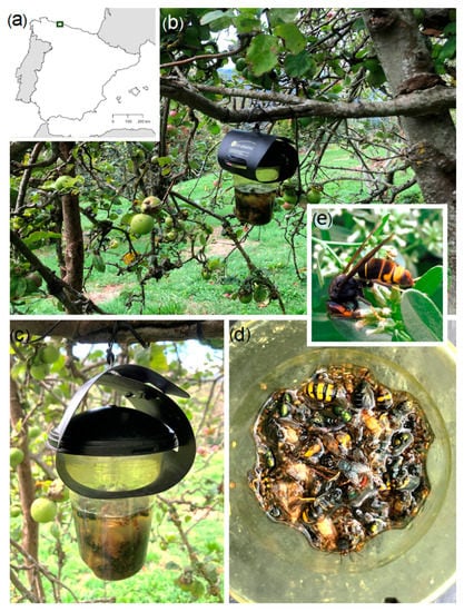 Diverse environmental factors (i.e., land cover, habitat structure, or human disturbance) can influence the effectiveness of the baited traps, increasing the chances to capture V. velutina in particular areas, such as rural localities where the governmental trapping campaigns were carried out in northern Spain (see https://www.asturias.es/general/-/categories/613173?p_r_p_categoryId=613173 accessed on 4 May 2021). Thus, for the study of the diversity of insects unintentionally captured by V. velutina traps, we analysed eight monitoring traps located in a plot with a majority plantation of apple trees located in a rural area of Loredo, Asturias, northern Spain (43°24′ N–6°44′ W, 310 m altitude) (Figure 1). At this locality, V. velutina (Figure 1e) has been present since 2016.