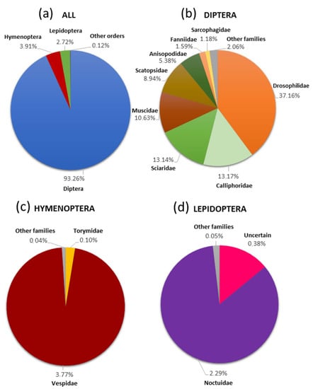 Percentages of the different orders of insects trapped in this study (a) and families most representative of the orders Diptera (b), Hymenoptera (c) and Lepidoptera (d).