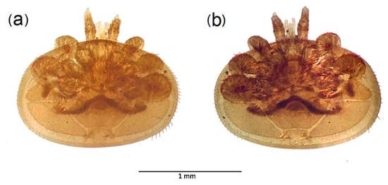 In addition to the mentioned insect species, three species of other taxonomic groups were found, i.e., Pomatias elegans (Müller, 1774) (Mollusca: Gastropoda: Pomatiidae), Dicranopalpus ramosus (Simon, 1909) (Arthropoda: Chelicerata: Arachnida: Opiliones) and a spider of the Family Salticidae (Arthropoda: Chelicerata: Arachnida: Araneae). Ectoparasitic mites of the genus Varroa (Arachnida: Acari: Parasitiformes) were found attached on five specimens of the 286 examined V. velutina specimens (one mite per V. velutina specimen). The prevalence rate of the Varroa parasite in V. velutina was of 0.017 (1.75%). In all cases, the mites were found clinging to the lateral-ventral part of the abdomen of V. velutina specimens. Additionally, two free specimens of the same mite genus were found in the attractant liquid from the traps. Varroa specimens found measured between 1.5 and 2 mm and corresponded with two colour morphotypes, one with darker colour (reddish-brown) and the other lighter (amber color) (Figure 3). The analysis of their morphological features showed that they were consistent with the diagnosis of the genus Varroa. This finding constitutes the first record of this genus of parasitic mites on V. velutina, presenting a newly recorded symbiotic association.