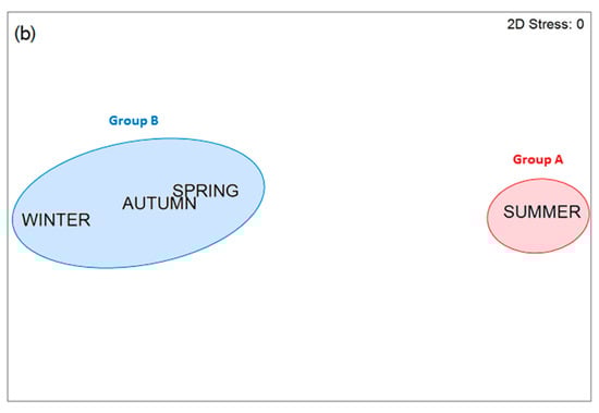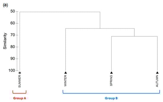 Cluster analysis carried out with abundance data showed two assemblages, Group A (Summer) and Group B (spring, autumn and winter) (Figure 4). Group A clustered the samples of summer and included 53 taxa.