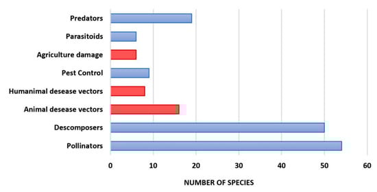 Among them, we can highlight those that cause damage to agriculture (8.1%) and those that act as vectors of both animal (21.6%) and human (10.8%) diseases (Figure 5).