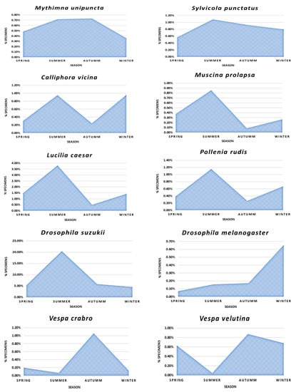 For the phenological analysis (Figure 6), the most abundant and representative species of the total sample were selected, i.e., seven species of Diptera (L. caesar, Pollenia rudis, Calliphora vicina, Muscina prolapsa, D. suzukii, D. melanogaster and Sylvicola punctatus), the lepidopteran Mythimna unipuncta and the hymenopterans V. velutina and V. crabro.