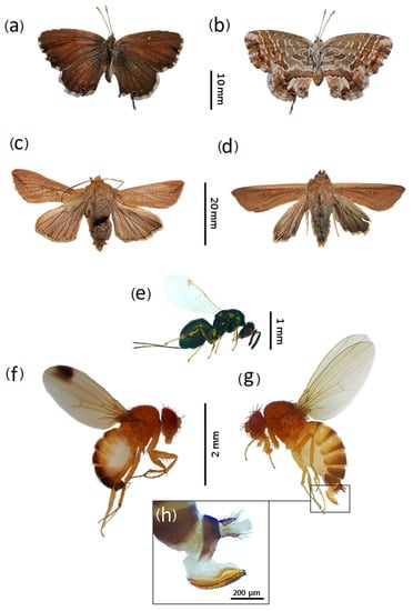Exotic and invasive species captured in the studied V. velutina traps. Cacyreus marshalli (Lepidoptera: Lycaenidae) dorsal view (a); ventral view of the same (b); Male of Mythimna unipuncta (Lepidoptera: Noctuidae) (c); female of the same (d); female of Torymus sinensis (Hymenoptera: Torymidae) (e); male of Drosophila suzukii (Diptera: Drosophilidae) (f); female of the same (g); detail of the oviscapt of female D. suzukii (h).