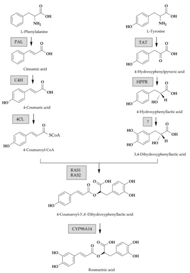 In S. miltiorrhiza, a biochemical study suggested that the initial committed step towards RA involves the hydroxylation of 4-hydroxyphenyllactate (pHPL) at C-3 in the aromatic ring to generate 3,4-dihydroxyphenyllactate (DHPL) [29]. Then, rosmarinic acid synthase (RAS) couples DHPL with the 4-coumaroyl moiety to form an ester, which is hydroxylated by a cytochrome P450-dependent monooxygenase CYP98A14 to form RA. It is partially different than in other plant species, where pHPL is the direct RAS substrate, coupled with 4-coumaroyl-CoA, and RA is formed by dihydroxylation of the ester [6,9,13,18].
