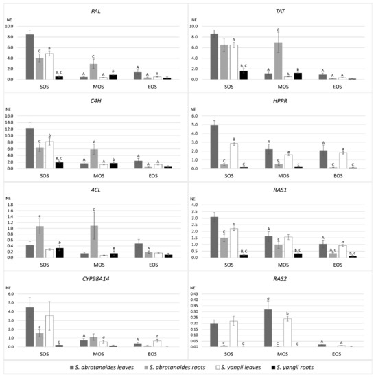Quantitative real-time PCR analysis was used to investigate the expression pattern of PAL, C4H, 4CL, TAT, HPPR, RAS1, RAS2 and Cyp98A14 in leaves and roots of S. abrotanoides and S. yangii. Gene transcript levels in each sample were normalized to the respective transcript level of ACT, which generated a normalized expression value (NE) (Figure 3). This analysis showed that, in leaves, the expression of the majority of genes encoding general phenylpropanoid pathway enzymes, a tyrosine-derived pathway, RAS1 and Cyp98A14 were significantly higher at the beginning of the season (SOS) than in two others analyzed time points. Indeed, the highest transcript levels have been detected for C4H (12.37), TAT (8.6) and PAL (8.5) in leaves of S. abrotanoides at the beginning of the season. In roots, transcript levels of all genes were the lowest at the end of the analyzed period (EOS).