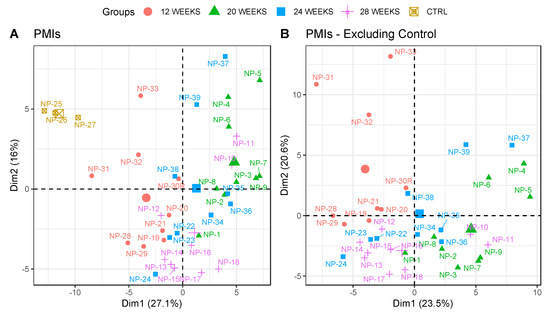PCA plot representing the samples grouped by their PMIs; (A) including control samples, and (B) excluding control samples. The same-coloured icons indicate the same PMI, as reported in the legend. Control (CTRL) = 0 weeks PMI. Protein abundances used for the PCAs were the ones whose q values were significant between the different conditions (n = 90, q < 0.05). The bigger icons in the plot for each group represent the centroids of the samples in the group.