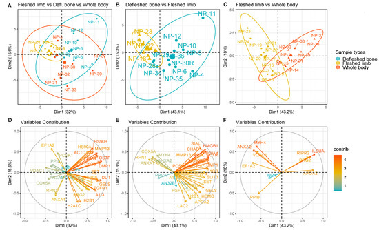 PCA plots (top) and variable maps (bottom) representing the samples grouped respectively in: (A,D) buried defleshed bones vs. exposed fleshed limbs; (B,E) exposed fleshed limbs vs. exposed whole bodies; and (C,F) buried defleshed bones vs. exposed fleshed limbs vs. exposed whole bodies. In each cluster, a bigger coordinate with the same colour was calculated as the centroids of the samples in the group. The same-coloured icons indicate the same condition. The ellipse shows a cluster categorised by the same condition (confidence interval of 0.95). Protein abundances used for the PCAs were the ones that were statistically significant according to their q values.