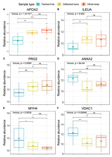 Boxplots with the relative abundances (arcsinh normalised) of (A) APOA2, (B) ILEUA, (C) PRG2, (D) ANXA2, (E) MYH4, and (F) VDAC1. Fleshed exposed limbs are represented in blue, defleshed buried bones in yellow, and exposed whole bodies in red. The plots provide extended p values for multivariate ANOVA and coded significance for Tukey’s HSD test (p < 0.0001 ‘****’; p < 0.001 ‘***’, p < 0.01 ‘**’, p < 0.05 ‘*’; p > 0.05 ‘ns’).