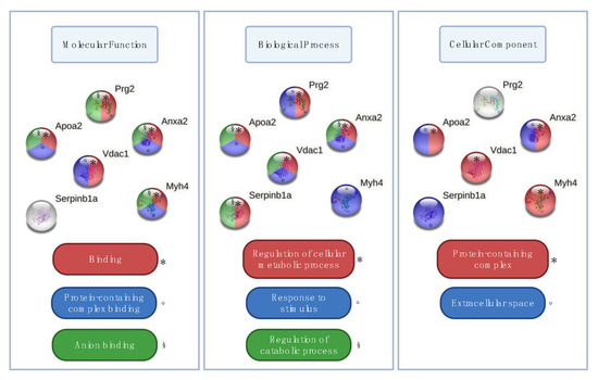 Functional enrichments in GO terms (molecular functions, biological processes, and cellular components) for the six proteins identified as being significant among the groups. For each GO class, different colours and symbols represent a specific GO term.