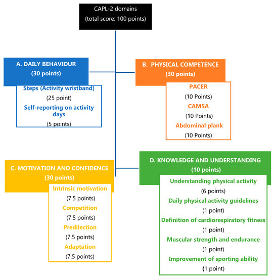 The Canadian Assessment of PL Development (CAPL-2) was applied [11,25]. This assessment covers 4 domains: daily behaviour, physical competence, motivation and confidence, knowledge and understanding. Thus, the domains are made up of different tests, which together sum up the score for each domain (Figure 1).