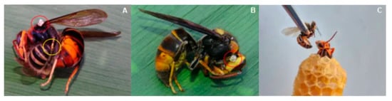 We monitored the nest entrances of 20 A. cerana colonies and 20 A. mellifera colonies over seven days from 10:00 to 15:00. We observed that 28 V. velutina foragers were heat-balled at the entrance of A. cerana colonies, but only two V. velutina foragers were heat-balled by A. mellifera colonies. Out of these 30 heat-balled hornets, only ten had honey bee stings in their bodies. One hornet had two stings in its veracervix, an intersegmental “neck-like” region [17], five had one sting each in the veracervix, one had a sting in its head capsule, two hornets were each stung once in their thoraces, and one was stung in a metathoracic leg (Figure 1). Through close observation, we found that most hornets (87%) were able to remove bee stings less than 1 min after being stung, so the majority of stings being left in the veracervix suggests that this structure may be particularly vulnerable.