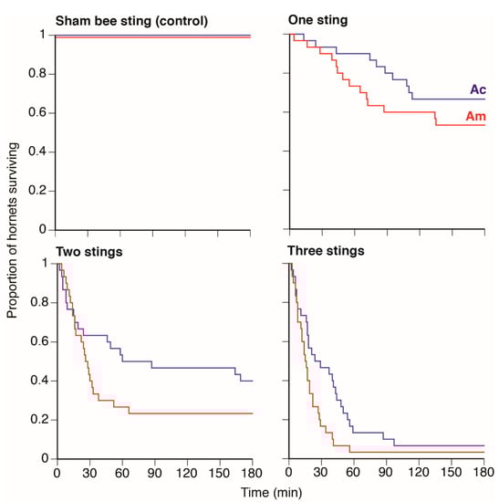 Effects of different numbers of bee stings from A. cerana (Ac) or A. mellifera guards (Am) on hornet survival over time. In the sham bee sting treatment, hornets were randomly assigned a priori as Ac or Am sham treatments and all survived (colored lines are slightly offset to facilitate visualization).