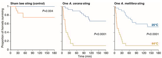 Effect of heat-balling temperature (=44 °C) and the species of bee sting upon hornet survival. The p-values derive from log-rank chi-square tests.
