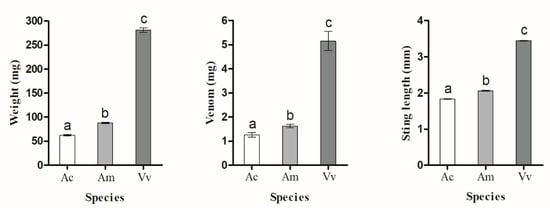 Comparisons between body mass, venom, and stinger length between A. cerana (Ac), A. mellifera (Ac), and V. velutina (Vv). Plots show the mean ± 1 standard error. Different letters indicate significant differences (Tukey HSD tests, p < 0.05).