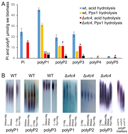 However, Ppx1 is highly specific for polyP, and the RNA contamination cannot lead to the overestimation of Pi released by the enzyme. The enzymatic assay provided the following estimates of the polyP content (Figure 1A): the cells of Δvtc4 mutant contained 10% and 20% of acid-soluble polyP and 20% of acid-insoluble polyP of the respective amounts in the parent strain. The total polyP content determined by enzymatic assay with Ppx1 was 48 and 7.4 μmol P/g wet biomass for WT and Δvtc4 strains, respectively.