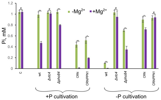 The Pi concentration in the medium after incubation with the cells of S. cerevisiae. The stationary grown cells of WT, Δvtc4, Δpho84, CRN, and CRN/PPN1 strains were incubated in water containing 110 mM glucose and 1 mM K2HPO4 and supplemented or not with 5 mM MgSO4. +P cultivation—the cells were pre-cultivated in the YPD medium with 4 mM Pi; −P cultivation—the cells were pre-cultivated in the YPD medium with 0.05 mM Pi; C—the medium was incubated without the cells, and the Pi concentration was measured with the same assay method. The experiments were performed in 3 replicates, the values denote mean, and the error bars denote s.d. ** p < 0.001, * p < 0.05, #—n.s., significance was assessed with the 2-tailed Student’s t-test comparing Pi concentrations (as shown by brackets) in the presence (+) and absence (-) of Mg2+.