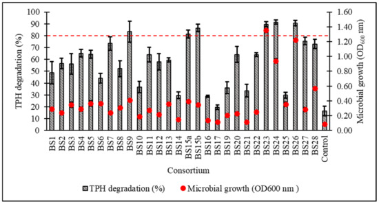 Percentage degradation of total petroleum hydrocarbons (TPH) and microbial growth (as OD600) after 7-day incubation in standardised Bushnell‒Haas (BH) broth enriched with 1% v/v initial diesel concentration. The dotted red line indicates ≥80% TPH degradation capacity. Error bars represent the mean ± standard deviation for experimental triplicates.