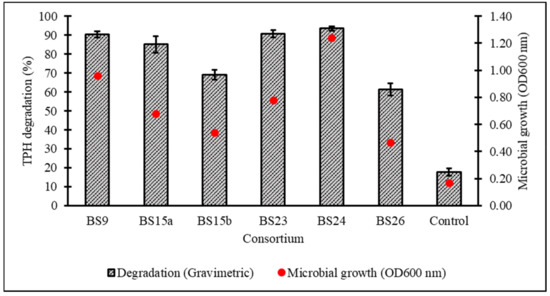 Percentage degradation of TPH and microbial growth (as OD600nm) achieved in secondary screening of six selected consortia in standardised BH broth enriched with 2% v/v initial diesel concentration. Error bars represent the mean ± standard deviation for experimental triplicates.