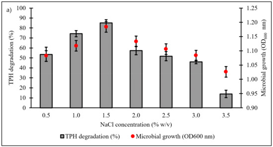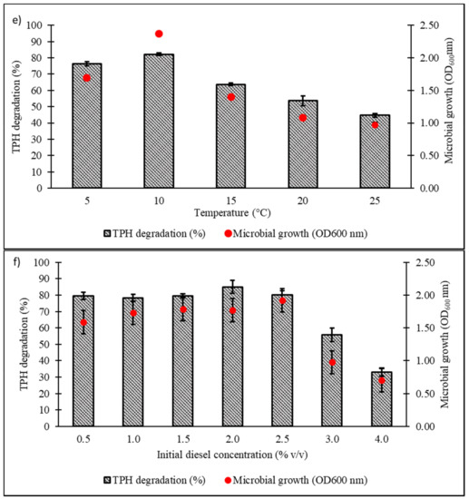 Low-weight hydrocarbons are prone to volatilisation and aerosolisation when shaken for a prolonged time, especially at elevated temperature set-ups to which it can contribute to erroneous analysis. It is therefore crucial to consider the abiotic loss in the calculation of TPH mineralisation, as seen in all bar figures in this study. As mentioned elsewhere, diesel is a myriad of hydrocarbons in which some of them were known to interfere with membrane integrity and function. In Figure 4f, the authors reported an intriguing interaction between the effects of increasing hydrocarbons concentration towards the microbial growths. The similar growth peaks (p < 0.05) at day 7 for diesel concentrations of 0.5% to 2.5% may be attributed to a form of microbial adaptation strategy which prefers individual cell survivability instead of actively undergoing cellular proliferation. At 3% and 4% of diesel concentrations, the microbial growth declined markedly as the cytotoxic effects become prominent and intolerable by the majority of the microbial population. However, this claim is crudely speculative and therefore needs further investigation.