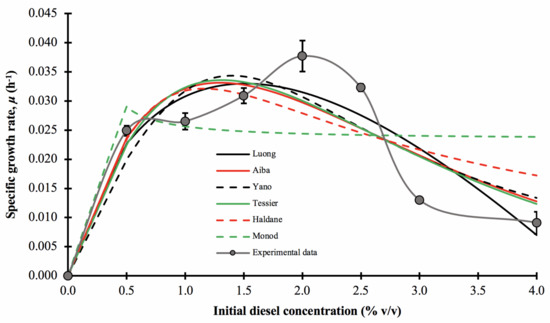 The effect of initial diesel concentration on the specific growth rate, μ, of consortium BS24, using OD600nm as a proxy for microbial growth and the experimentally assessed and predicted specific growth rates fitted to selected mathematical models at different initial diesel concentrations. The error bars represent the mean ± standard deviation of experimental triplicates.