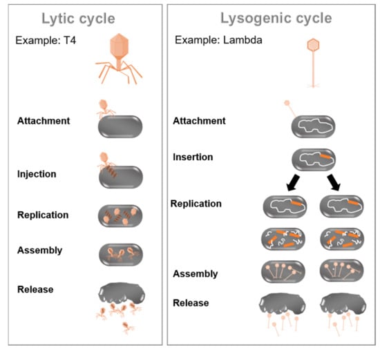 Viral interactions are ecologically fundamental since viruses are responsible for many diseases in various eu- and prokaryotic hosts []. The present review focuses on the viruses infecting bacteria and the modulation of bacterial communities through those (bacterio) phages. Phages are the most abundant microorganisms in the biosphere, with an estimated 4.8 × 1031 particles []. Phages are present in all areas, coexisting parallel to their bacterial hosts in the majority of ecosystems []. Phages are well known as drivers of microbial diversity, vectors of horizontal gene transfer, sources of diagnostic and genetic tools, and therapeutics []. Bacteriophages are natural killers of bacteria and can be classified according to their genome, morphology, biological cycle, or provenance []. A prominent distinguishing feature of phages is their biological cycle []. There are two main types, the lytic and lysogenic cycle (as illustrated in Figure 3). During the lytic cycle, phages attach to the host cell’s surface to inject their nucleic acids into the cell. Subsequently, the host cell DNA is degraded, and the host metabolism is directed to initiate phage biosynthesis. The phage nucleic acids replicate inside the bacterium. Accordingly, entire viral phage particles are assembled, which are released from the infected cell through lysis of the bacterial cell. In contrast, the lysogenic cycle is based on the integration of the genetic material of the phage into the genome of the host cell to produce a prophage (or temperate phage). When the bacterium reproduces, the prophage is also copied and passed to each daughter cell. The daughter cells can continue to replicate with the prophage, or the prophage can exit the bacterial chromosome to initiate the lytic cycle []. The initiation of phage infection is triggered by the specific recognition between the phage-binding protein located at the tip of the tail or the capsid envelope and a receptor located on the host cell’s surface []. Cell surface receptors recognized by the phage may include protein receptors (OmpA and OmpC), lipopolysaccharide (LPS) receptors, receptors located in capsular polysaccharides (Vi-antigen), and pili and flagella [].