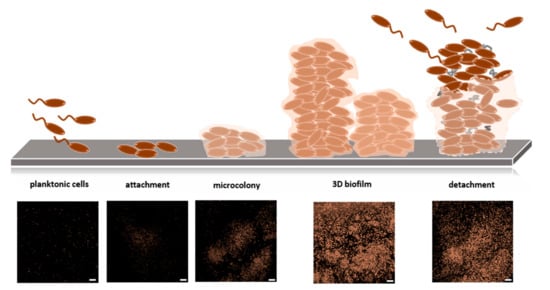 Biofilms are one of the most widely distributed and successful modes of microbial life []. A biofilm is defined as an aggregate of microorganisms in which cells are embedded in a self-produced matrix of extracellular polymeric substances (EPS) []. The interaction of cells initiates biofilm formation with a surface or with each other. It is supposed that the planktonic bacteria adhere to the surface initially through reversible adhesion via van der Waals forces. Attached cells proliferate and produce an extracellular matrix to form microcolonies, in which communication among the cells through biochemical signals and a genetic exchange is facilitated. The matrix contains exopolysaccharides, extracellular DNA, RNA, and proteins. Cells further proliferate, and spatial structuring occurs in all dimensions, resulting in a mature three-dimensional biofilm. Over time, microcolonies undergo cell death and lysis along with active dispersal of motile bacteria [] (as illustrated in Figure 5). A biofilm is assumed to maintain an equilibrium through growth and dispersal []. Biofilms are complex systems typically comprising many species of high cell densities, ranging from 108 to 1011 cells/g wet weight []. Biofilms drive biogeochemical cycling processes of most elements in water, soil, sediment, and subsurface environments. All higher organisms are colonized by biofilms, which can be correlated with persistent infections in plants and animals, including humans []. Furthermore, biofilms cause contamination of medical devices and implants, biofouling, contamination of process water or even drinking water, and corrosion []. In contrast, biofilms are used in biotechnological applications, including filtration of drinking water, degradation of waste (water), and biocatalysis of biotechnological processes, such as producing bulk and fine chemicals as well as biofuels [].