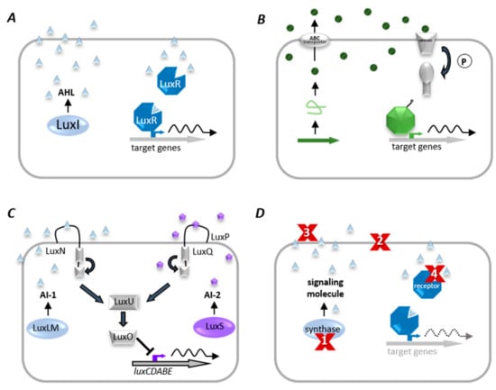 QS systems were found in both Gram-negative and Gram-positive bacteria []. Gram-negative bacteria communicate via acylated homoserine lactones (AHLs) (as illustrated in Figure 6A) []. The first description of QS was on the bioluminescent marine bacterium Vibrio fischeri. At high cell densities, in symbiotic association with the Hawaiian bobtail squid Euprymna scolopes, V. fischeri activates bioluminescence through QS and supports the squid in masking its shadow during predator avoidance. Two components, LuxI and LuxR, impact the expression of target genes, e.g., the lux operon (luxICDABE) responsible for bioluminescence in V. fischeri []. Similar AHL QS systems were since shown to be widely distributed in Gram-negative bacteria controlling diverse behaviors, such as the production of secreted toxins and virulence factors, biofilm formation, and conjugation. Many bacteria harbor more than one signal-receptor combination []. For example, P. aeruginosa has two complete LuxRI-type homologs, LasRI and RhlRI, which operate in a hierarchy []; and B. thailandensis has even three LuxRI homologs []. It was proposed that energy-costly resourcing of different AHL communication systems might provide specific benefits in different environments []. Gram-positive bacteria communicate using modified oligopeptides and two-component regulatory systems (as illustrated in Figure 6B). Briefly, the signaling molecules are either unmodified or posttranslationally modified small peptides secreted via ABC exporter proteins. Phosphorylation of the receptor kinase due to peptide binding activates the regulatory protein, which acts as a QS target gene transcription factor []. Virulence factor production in Bacillus cereus and Staphylococcus aureus, the competence of B. subtilis, and the biofilm formation of Streptococcus pneumonia are only a few examples of QS-dependent gene regulation in Gram-positive bacteria [,]. QS allows bacteria not only to communicate within their own, but also between different bacterial species. Therefore, autoinducer-2 (AI-2) is synthesized and recognized by many different bacterial species. Thus AI-2 appears to be an almost universal signal (as illustrated in Figure 6C) []. The AI-2 system was first described in V.harveyi []. The AI-2 synthase, called LuxS, produces the AI-2 precursor, 4,5-dihydroxy-2,3-pentadione (DPD) []. DPD can spontaneously cyclize to generate some isoforms, collectively referred to as AI-2 [,,]. Different isoforms bind different signal receptors; for instance, the S-form binds to the signal receptor LuxP in V. harveyi, whereas the R-form binds to the LsrB receptor protein in Salmonella enterica serovar Typhimurium or E. coli []. For instance, it was reported that AI-2 is involved in the regulation of bacteriocin production and biofilm formation in S. mutans, biofilm formation of S. anginosus and Listeria monocytogenes, virulence regulation of S. pneumonia and S. pyogenes, and toxin production in Clostridium (reviewed in []). In general, the bacterial response to certain autoinducers is manifold and adaptable. Vastly different bacterial genera can detect the same compound as in the case of AI-2. Slightly modified molecules of the same chemical class even activate different responses among different species of the same genus []. Correspondingly, a number of chemically different QS molecules act jointly in a particular organism [].
