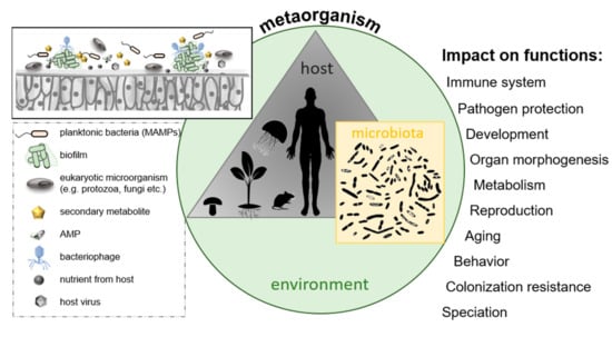 Half a century ago, Lynn Margulis first recognized the importance of bacteria in the evolution of higher organisms [,,,]. In 2007, the term “hologenome” was introduced by Ilana Zilber–Rosenberg and Eugene Rosenberg to describe the sum of the host genome and associated microbial genomes [,,]. This settled the base for a still ongoing paradigm shift in biology. Nowadays, a new conceptual framework—the holobiont/metaorganism concept—is established, considering a holobiont/metaorganism as the sum of a multicellular host and its associated species (as illustrated in Figure 7) []. The holobiont theory considers all associated species irrespective of their type of association (transient or permanent) or their function. The metaorganism concept focuses on the function and contribution (beneficial or detrimental) of the host-associated microbiota in a given environment, which depend on the identity, abundance, and activity of the microbes (in the following, the term “metaorganism” is primarily used) [,,]. The growing awareness that multicellular organisms cannot be considered in isolation but only in the interdependence with their associated microbes led to two important insights. Firstly, the health and fitness of a host appear to be fundamentally multiorganismal, where any disturbance within the complex partnership can have drastic consequences for the members’ health. Secondly, host and microbes intensively interact and coevolve [,,] (as illustrated in Figure 7). Several studies already indicate that a specific host-associated microbiota contributes to host metabolism, development, organ morphogenesis, pathogen protection and immunity, behavior, environmental sensing and adaptation, developmental transitions, and reproduction [,,,,,,,,,,,,,,,] (as illustrated in Figure 7). A specific microbe or consortia function is not static because it depends on the host’s developmental stage, age, reproductive state, or physiological condition [,,]. The vast contribution of the microbiota to the fitness of its host was unraveled mainly in the last decade. Protection against pathogens and provision of essential nutrients were identified as the most general and important contributions of the associated microbiota to the host´s health. In corals, commensal bacteria protect against the bleaching pathogen V. shiloi [] and produce inhibitors to reduce colonization by pathogens on coral mucus []. Several experiments further reported that sterile animals are considerably more sensitive to infection and death following administration of a pathogen than conventional animals, e.g., shown for infection of guinea pigs with Shigella flexneri [], mice with V. cholera [], and rabbits with Bacteroides vulgatus []. Likewise, in humans, the normal microbiota was shown to protect against infection by pathogens in the oral cavity, the intestine, the skin, and the vaginal epithelium [,,,]. Representatives of the genera Pseudomonas, Flavobacteria, and Bacillus can protect plants from phytopathogens through direct interaction with the pathogen or by inducing systemic resistance in plant hosts [,]. In general, microorganisms residing in a plant’s rhizosphere are essential for plant growth promotion, disease suppression, removing toxic compounds, and assimilating nutrients to plants []. Moreover, utilizing such beneficial microbes for crop productivity presents an efficient way to modulate the crop yield and productivity by maintaining the health status and quality of the plants [,,]. The utilization of beneficial microbe-plant interactions is now turning into the standard against the chemical-based and synthetic pesticides and fertilizers in the agriculture industry [,,]. Moreover, the contribution of the microbiota to the nutrition of the hosts is known for many years. For example, chemoautotrophic bacterial symbionts, like sulfur-oxidizing bacteria, synthesize organic matter from CO2 and are the primary source of nutrition for their animal host []. In turn, the host, like clams and mussels, provides its symbionts a habitat, in which they have access to the substrates of chemoautotrophy (O2, CO2, and reduced inorganic compounds such as H2S) []. In humans, the gut microbiota is a complex ecosystem that plays an essential role in the catabolism of dietary fiber, production of vitamins and amino acids, and detoxification of harmful chemicals [,]. In recent years, several studies further demonstrated that the microbiome also contributes to the development of a variety of tissues, functions, and organs [,]. An illustration of bacteria-dependent development can be seen for many green algae, which develop abnormally in the absence of bacteria []. For example, the marine green alga Ulva lactuca loses its typical leafy morphology in axenic culture and develops into pincushion-like colonies. However, these abnormal algal colonies can be restored to their typical morphology by recolonization with appropriate marine bacteria []. Also, gut bacteria were shown to shape the tissues, cells, and molecular profile of the mammalian gastrointestinal immune system during development []. Microbes interact with the host cells through adhesive molecules on their surface, thus promoting interaction with host cell receptors and triggering host responses among those immune responses and metabolic and behavioral reactions []. For instance, first experiments with mice demonstrated that gut microbiota affects the brain and, consequently, behavior []. It is most likely that during evolution, gut microbiota colonization became integrated into the programming of brain development affecting the central nervous system and behavior []. Bacteria communicate with the brain via changing levels of dietary metabolites and hormones []. The gut microbiota can be a key regulator of mood, cognition, pain, and obesity []. Understanding the microbiota–gut–brain axis can give new insights into individual variations in cognition, personality, mood, slee
