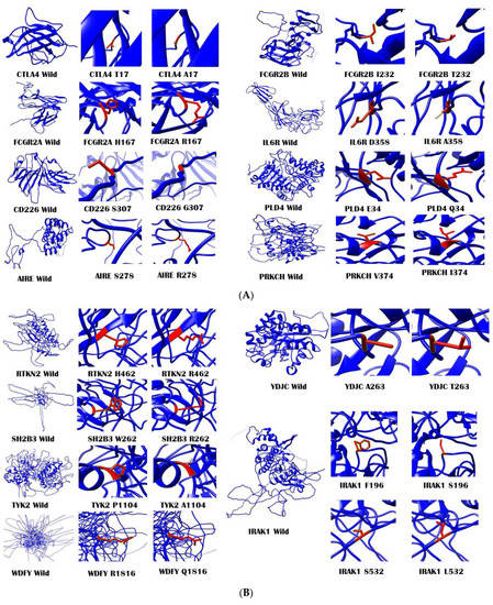 Modeled structures using MODELER v9.22 for wild-type proteins along with a close-up of wild and mutated amino acid residues. (A) Modeled structures for CTLA4, FCGR2A, CD226, AIRE, FCGR2B, IL6R, PLD4, and PRKCH. (B) Modeled structures for RTKN2, YDJC, SH2B3, TYK2, WDFY4, and IRAK1. (C) Modeled structures for NFKBIE, PADI4, PTPN22, and TNFAIP3. All the protein structures were visualized, and figures were generated using Chimera v1.11 software (https://www.cgl.ucsf.edu/chimera/, accessed on 3 February 2021). The structures were then assembled and combined using Microsoft PowerPoint 2016.