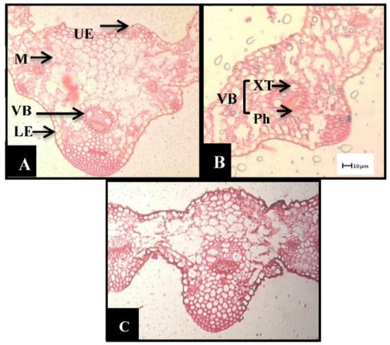 Effects of drought on barley leaves (transverse sections). (A) Control. (B) Plants irrigated once (D1), (C) plants irrigated twice (D2) (X 200). UE: upper epidermis, MT: mesophyll tissue, VB: vascular bundles, LE: lower epidermis, XT: xylem tissue, PhT: phloem tissue. (Hafez et al. [10]).
