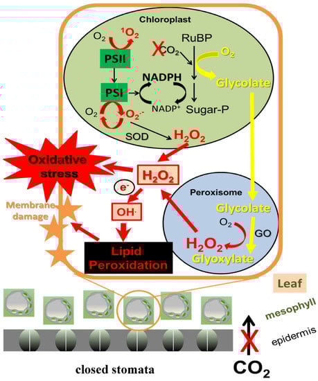 Drought stress may cause excessive accumulation of ROS due to perturbations in photosynthesis, resulting in oxidative stress within plant cells. Drought-induced closure of stomata restricts carbon dioxide (CO2) uptake, causing overaccumulation of reduced photosynthetic electron transport components (e.g., NADPH) in chloroplasts and increased oxygenation of ribulose-1,5-bisphosphate (RuBP). This accelerates the production of glycolate. In peroxisomes, glycolate is converted to glyoxylate and hydrogen peroxide (H2O2) by glycolate oxidase (GO), accounting for most of peroxisomal H2O2 production in green tissues of C3 plants. These processes also favor the chloroplastic accumulation of the ROS superoxide (O2•−), singlet oxygen (1O2) and H2O2 by the photosynthetic electron transport chain (PSI and PSII). H2O2 from chloroplasts and peroxisomes may be transferred to the cytoplasm, where massive oxidative stress and membrane lipid peroxidation may develop, especially due to the action of the H2O2-derived hydroxyl radical (OH•). Based on Noctor et al. [56] and Nadarajah [57].