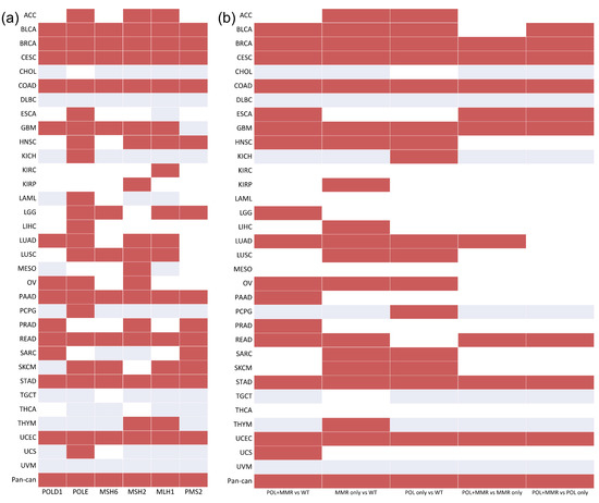 The association between TMB and the mutation status of the MMR and POL genes/gene sets in 33 cancer types and pan-cancer: (a) MMR and POL genes; (b) MMR and POL gene sets. Red indicates that the mutation status of the specific gene/gene set is significantly associated with high TMB. White indicates that mutation in the specific gene/gene set has no significant association with high TMB. Gray indicates that there is no mutation in this specific gene/gene set.