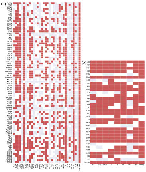 - Knijnenburg, T.A.; Wang, L.; Zimmermann, M.T.; Chambwe, N.; Gao, G.; Cherniack, A.D.; Fan, H.; Shen, H.; Way, G.P.; Greene, C.S.; et al. Genomic and Molecular Landscape of DNA Damage Repair Deficiency across The Cancer Genome Atlas. Cell Rep. 2018, 23, 239–254.e6. [Google Scholar] [CrossRef]