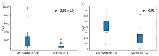 For each DDR gene, patients were divided into two groups based on the mutation status of the gene: the mutated group (nonsynonymous variant) and the wild-type group. The Mann–Whitney U test was used to investigate whether a significant difference existed between the TMBs of the two groups. A significant difference (p < 0.05) indicated that the mutation status of the DDR gene was significantly associated with TMB.