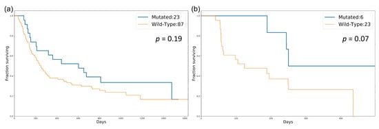 Survival analysis for patients in the mutated and wild-type groups in SKCM and LUAD: (a) comparison of OS in SKCM; (b) comparison of PFS in LUAD. p-value was calculated by the log-rank test.