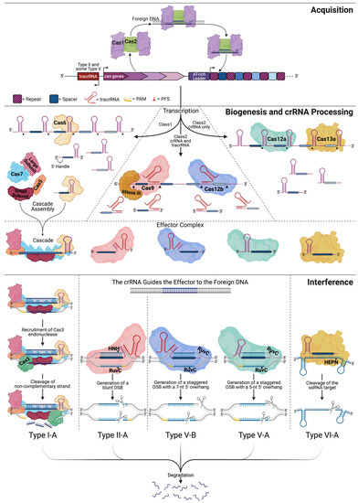 - Makarova, K.S.; Wolf, Y.I.; Alkhnbashi, O.S.; Costa, F.; Shah, S.A.; Saunders, S.J.; Barrangou, R.; Brouns, S.J.; Charpentier, E.; Haft, D.H.; et al. An updated evolutionary classification of CRISPR-Cas systems. Nat. Rev. Microbiol. 2015, 13, 722–736. [Google Scholar] [CrossRef]