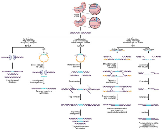 NHEJ is the predominant DSB repair pathway in most eukaryotes, active throughout the cell cycle, with increased activity in the progression from G1 to G2/M [134,135,136,137,138,139,140]. NHEJ repairs DSBs through direct ligation of broken ends, either without a homologous template or with up to 4 bp of microhomology [141]. During NHEJ: (i) the Ku heterodimer recognizes and binds the broken ends, (ii) factors such as the DNA-dependent protein kinase catalytic subunit (DNA-PKcs) and nuclease Artemis are recruited to the site for processing, (iii) nucleotide addition by a polymerase can occur if needed, and (iv) the DNA-ligase IV complex performs ligation of the ends [141]. Often, the broken DNA ends undergo processing by exonucleolytic or endonucleolytic enzymes to expose regions of ≤4 nt microhomology, which leads to deletions of various sizes. It is worth noting that NHEJ can be used to delete entire genes by utilizing two sgRNAs designed to target each end of the gene [142,143,144]. On the other hand, the activity of DNA polymerase μ and λ can lead to a gain of nucleotides, resulting in insertions. Given the fast kinetics of repair, high efficiency, and high rate of indel formation, NHEJ has historically been exploited for targeting large deletions and gene knockout (KO) generation. More recently, knock-ins have been added to the repertoire of gene editing processes exploiting NHEJ through homology-independent targeted integration (HITI) [145,146]. HITI is an NHEJ-related approach that utilizes a donor fragment flanked by Cas9 cleavage sites [145,146]. Cas9 cleaves the donor sequence and the genomic target at the same time, triggering the NHEJ pathway and can result in ligation of the linear donor fragment into the target locus. HITI is also used to generate targeted edits and knock-ins in dividing and non-dividing cells by creating blunt end DSBs in the target and donor and has a higher efficiency than HDR, as NHEJ is more active in the cell [145,146].
