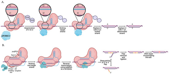 The initial menu of base editors were limited until 2017 when Gaudelli et al. engineered a base editing adenine deaminase from a tRNA adenine deaminase (TadA) to convert adenines to inosines (read as guanines), allowing the conversion of A:T to G:C [238]. Now CBEs and ABEs (adenosine base editors) have been used in a variety of cell types and organisms to study point mutation mutagenesis and the biology associated with point mutation corrections [241,242,243,244,245,246]. By fusing the RNA-targeting dCas13 to ADAR2 (adenosine deaminase RNA specific) or the engineered cytidine deaminase, RNA editing (RESCUE; RNA editing for specific C-to-U exchange) can be reversible and temporally controlled [191,247]. Unfortunately, CBEs and ABEs remained limited to transitions, and not transversions, until prime editors (PEs) were introduced (Figure 4B). Prime editing targets insertions, deletions, or conversions of all 12 combinations of point mutations without a donor template or creating DNA DSBs [248]. First-generation prime editors (PE1) required just two elements: an nCas9-reverse transcriptase (RT) fusion protein and a primer editing guide RNA (pegRNA) [248]. The pegRNA contains the spacer sequence complementary to the target, a primer binding site region (8–16 nt), and the sequence containing the new genetic information to be introduced into the target. The pegRNA guides the Cas complex to the target, where the primer binding site binds the non-target strand. The RT then directly copies the genetic information from the pegRNA to the target strand [248].