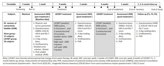 The current prospective, randomized, single-blinded trial was performed in a tertiary medical center from December 2018 through January 2020. It was carried out under the approval of Institutional Review Board (IRB No. KMUHIRB-F(II)-20180010) and was registered at clinicaltrials.gov (NCT04059133) on 16 August 2019. The major inclusion and exclusion criteria are shown in Table 1. 65 female eligible participants recruited from outpatient clinics were provided with informed consent before entering the study and were randomly allocated to the sham group (n = 15) or the LiESWT group (n = 50) by computer generated random numbers. The timetable designed for clinical trial of OAB is shown in Figure 1.