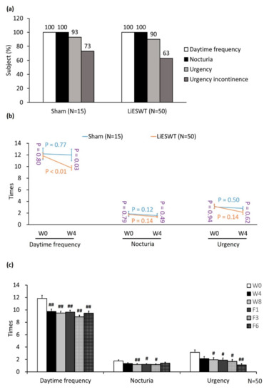 Analysis of studied population with OAB symptoms. (a) The percentage of studied population with OAB symptoms. OAB symptoms consisted of daytime frequency, nocturia, and urgency with or without urgency incontinence. (b) The changes in daytime frequency, nocturia and urgency at W4, as compared with W0. The blue or orange font denotes the p-value before and after 4 weeks treatment in the sham group or in the LiESWT-treated group, respectively. The purple font indicated the p-value between the sham group and the LiESWT-treated group at W0 and W4. (c) LiESWT improved the OAB symptoms. The mean values of daytime frequency, nocturia and urgency were meaningfully decreased after LiESWT treatment at W8. W0: the baseline, W4: 4-week of LiESWT treatment, W8: 8-week of LiESWT treatment, F1: 1-month follow-up, F3: 3-month follow-up, F6: 6-month follow-up. # p < 0.05; ## p < 0.01 as compared with W0.