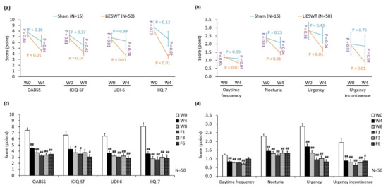 Improvement of OAB symptoms and life bothersome questionnaire scores after LiESWT treatment. (a,c) The therapeutic effect of LiESWT was analyzed by the OAB symptoms and life bothersome questionnaires, including OABSS, ICIQ-SF, UDI-6, and IIQ-7. LiESWT treatment significantly reduced the scores of OABSS, ICIQ-SF, UDI-6, and IIQ-7 as compared with the sham group. (b,d) Improvement of questionnaires scores for OAB symptom after LiESWT treatment, including daytime frequency, nocturia, urgency, and urgency incontinence. LiESWT improved OAB symptoms and the QoL. OABSS, overactive bladder symptom scores. ICIQ-SF: international consultation on incontinence questionnaire-short form, UDI-6: urogenital distress inventory–6, IIQ-7: incontinence impact questionnaire-7, W0: the baseline, W4: 4-week LiESWT treatment, W8: 8-week LiESWT treatment, F1: 1-month follow-up, F3: 3-month follow-up. The blue or orange font denotes the p-value before and after 4 weeks treatment in the sham group or in the LiESWT group, respectively. The purple font indicates the p-value between the sham group and the LiESWT group at the W0 and W4. # p < 0.05; ## p < 0.01 compared to W0.