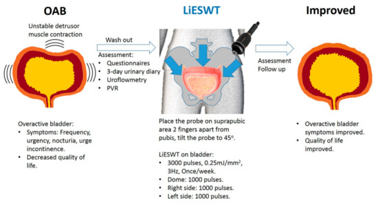 In the present research, we hypothesized LiESWT could reduce bladder inflammation, increase angiogenesis, ameliorate OAB symptoms, and thus improve social activity and QoL. The goal of the present study is to evaluate the therapeutic efficacy and duration of LiESWT on OAB participants, including ameliorating OAB symptoms, increasing voided volume, and improving patients’ social activity and QoL.